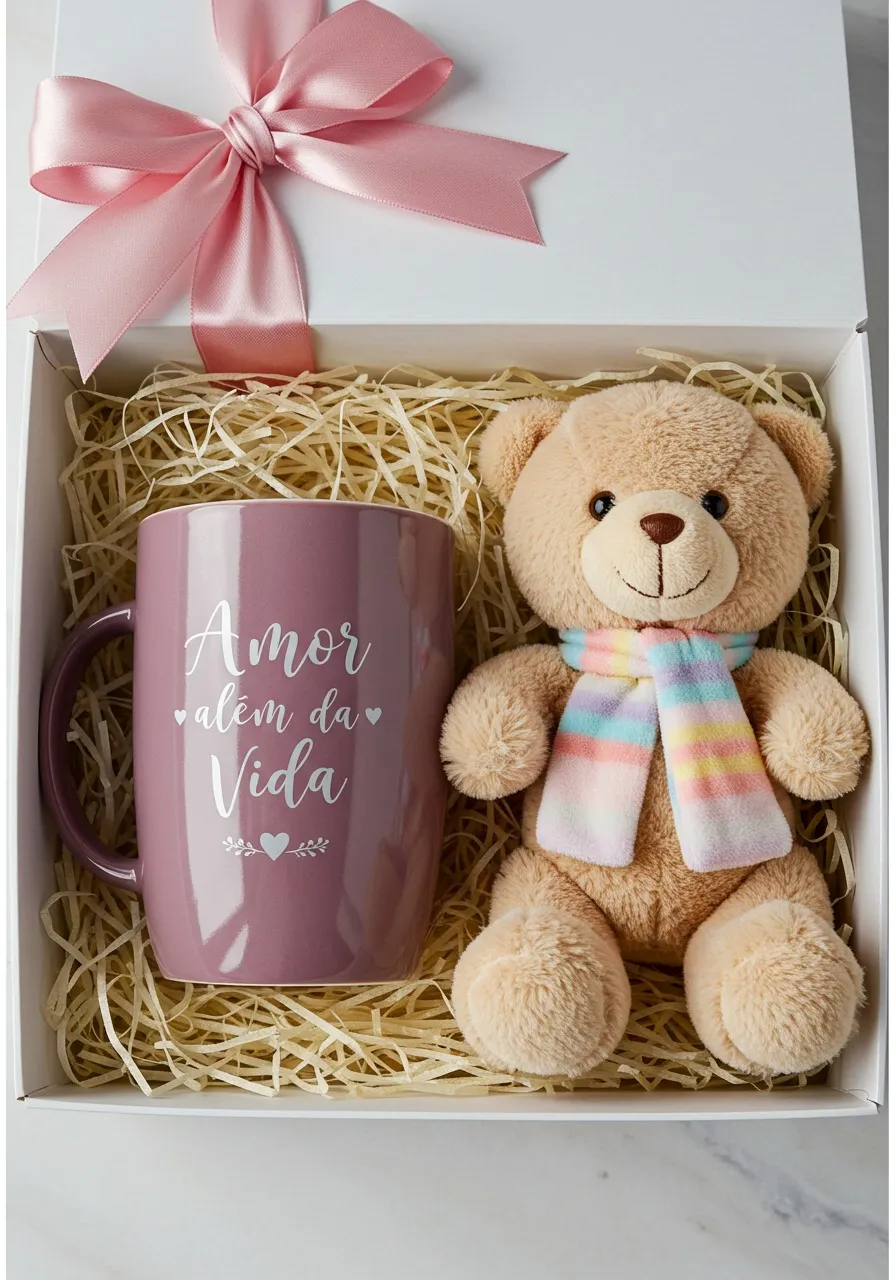 A caneca, feita com material de alta qualidade, combina beleza, resistência e conforto, transformando cada gole em um momento de amor. Já a pelúcia, com toque macio e delicado, é o abraço que ela vai poder guardar para sempre.