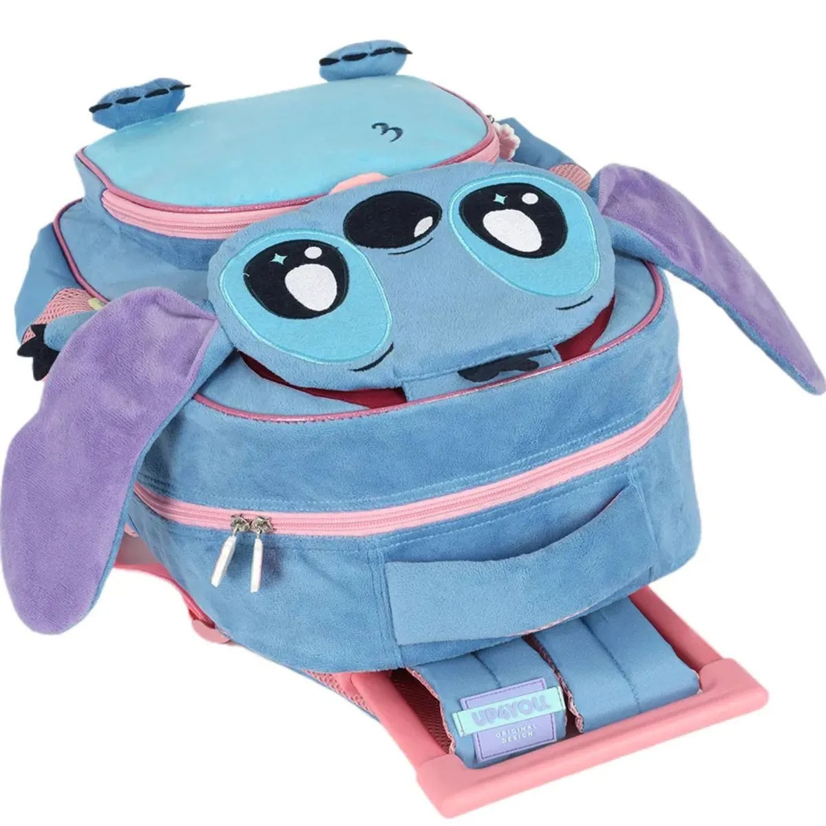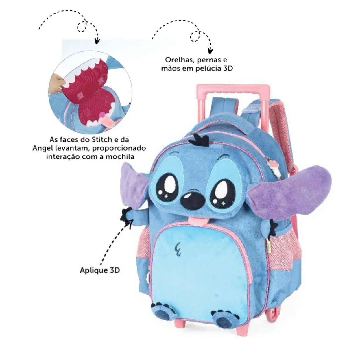 Com um design peluciado e detalhes em alto-relevo, a mochila apresenta o rosto e o corpo dos personagens em 3D, com orelhas, mãos e pernas que ganham volume, tornando cada modelo único e encantador. Um dos diferenciais mais divertidos é que as faces do Stitch e da Angel levantam, proporcionando interação e deixando a experiência ainda mais lúdica e mágica para as crianças.